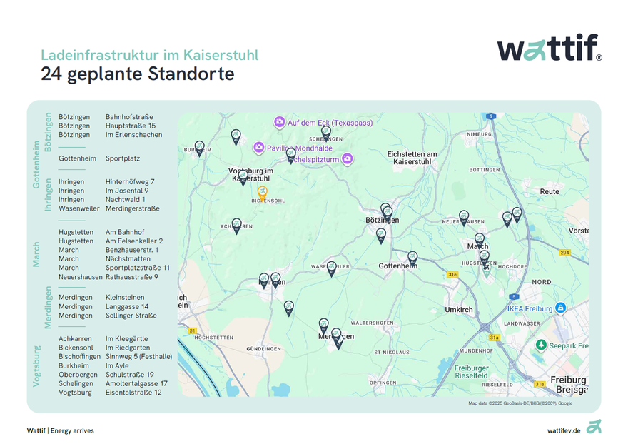 Mit wattif wurde ein Betreiber gefunden, der in allen Ortsteilen Ladesäulen installiert – und das zu attraktiven Konditionen. Die Gemeinden stellen die Flächen 10 Jahre lang kostenlos zur Verfügung, wattif übernimmt die Kosten für Tiefbau, Installation und Betrieb. Die erste Ladesäule wurde am 24. September in Vogtsburg-Bickensohl feierlich von Landrat Christian Ante, den beteiligten Bürgermeistern und dem Betreiber eröffnet. Bis Ende des Jahres wird in jeder der sechs Gemeinden mindestens eine Säule in Betrieb sein, im Frühjahr 2026 werden alle Ladesäulen stehen.