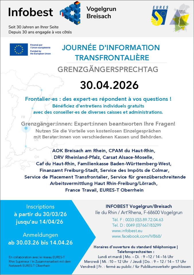 Grenzgängersprechtag der INFOBEST Vogelgrun/Breisach am Donnerstag, 30. April