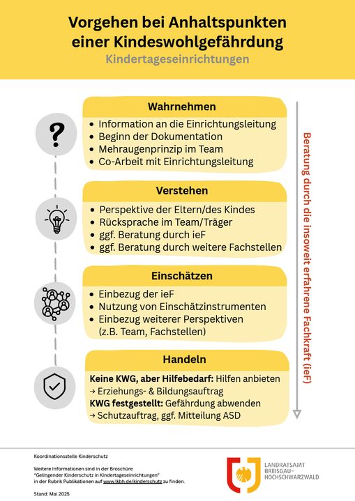 Junge Menschen vor Gefahren für ihr Wohl zu schützen ist einer der zentralen Grundsätze der Kinder- und Jugendhilfe. Das Landratsamt Breisgau-Hochschwarzwald möchte die Akteure der Kinder- und Jugendhilfe in der Wahrnehmung dieses Schutzauftrages unterstützen. Hierzu werden in regelmäßig stattfindenden Arbeitskreisen unter Beteiligung relevanter Akteure Konzepte und Arbeitshilfen entwickelt, die mehr Handlungssicherheit im Umgang mit kindeswohlgefährdenden Situationen geben sollen.