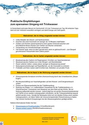 Die Bundesregierung hat am 15. März dieses Jahres die Nationale Wasserstrategie mit zahlreichen Maßnahmen zur langfristigen Sicherung des Trinkwassers in Deutschland beschlossen. Anlässlich des Weltwassertages am 22. März sensibilisieren die Fachbereiche Wirtschaft und Klima und Wasser und Boden mit Hintergrundinformationen und Tipps zum sparsamen Umgang mit Trinkwasser für das Thema.