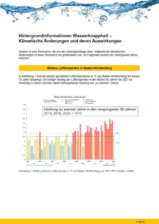 Die durchschnittliche Jahrestemperatur steigt seit geraumer Zeit an, während die Niederschlagsmengen gerade in den Sommermonaten zurückgehen. Im Oberrheingraben wird Trinkwasser vor allem aus Grundwasser gewonnen.