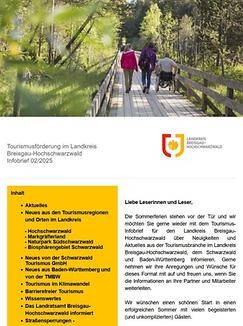 Der "Tourismus-Infobrief“ der Tourismusförderung ist ein regelmäßig erscheinendes Medium für touristische Partner und Leistungsträger im Landkreis Breisgau-Hochschwarzwald. Neuigkeiten, interessante Projekte und Aktionen aus den Kreis-Gemeinden und -Destinationen sowie wichtige Tourismus-Informationen des Landratsamtes sollen mit ihm kommuniziert werden. Zielgruppe sind vor allem die Mitarbeiter von Touristinformationen und Hotel-Rezeptionen, die im ständigen Gäste-Kontakt stehen.