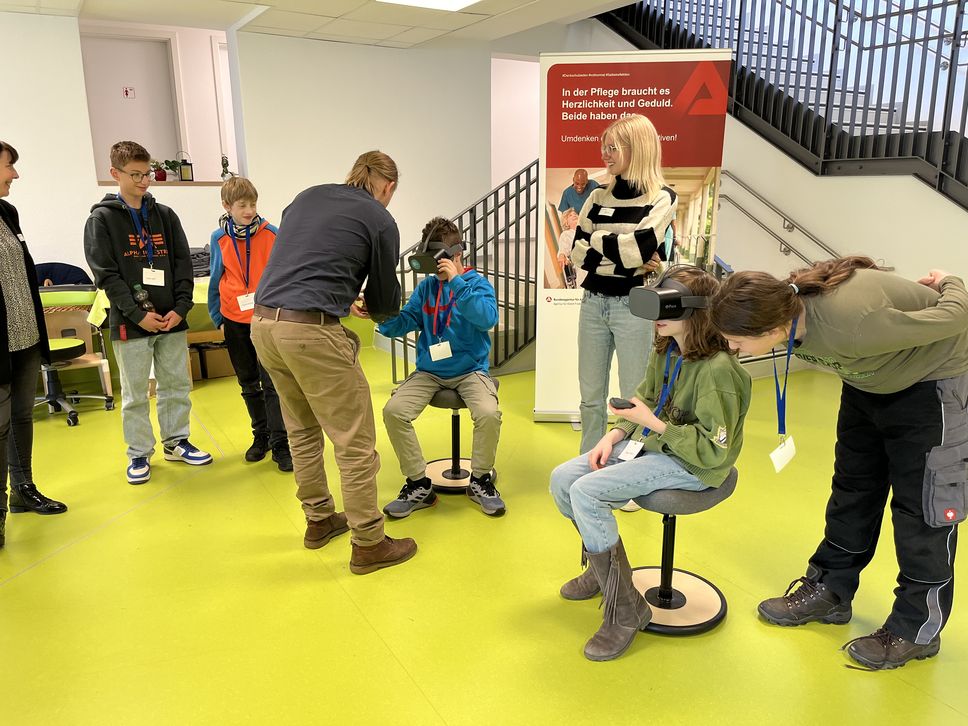 Interessierte Jungen im Alter von 12 bis 16 Jahren durchliefen verschiedene Mitmach-Stationen, um die Berufe Pflegefachmann und Erzieher spielerisch kennenzulernen. Bei der Berufsorientierung unterstützten Virtual Reality Brillen, um in den Arbeitsalltag in einem Krankenhaus, einem Seniorenwohnheim oder einer Kita einzutauchen und ihn in 360° zu erleben. Weitere Highlights waren ein Alterssimulationsanzug, ein Rollstuhl Parcours, Blutdruck messen, ein Babysitterschnupperkurs und natürlich die aufgeweckten Kita Kids vor Ort.