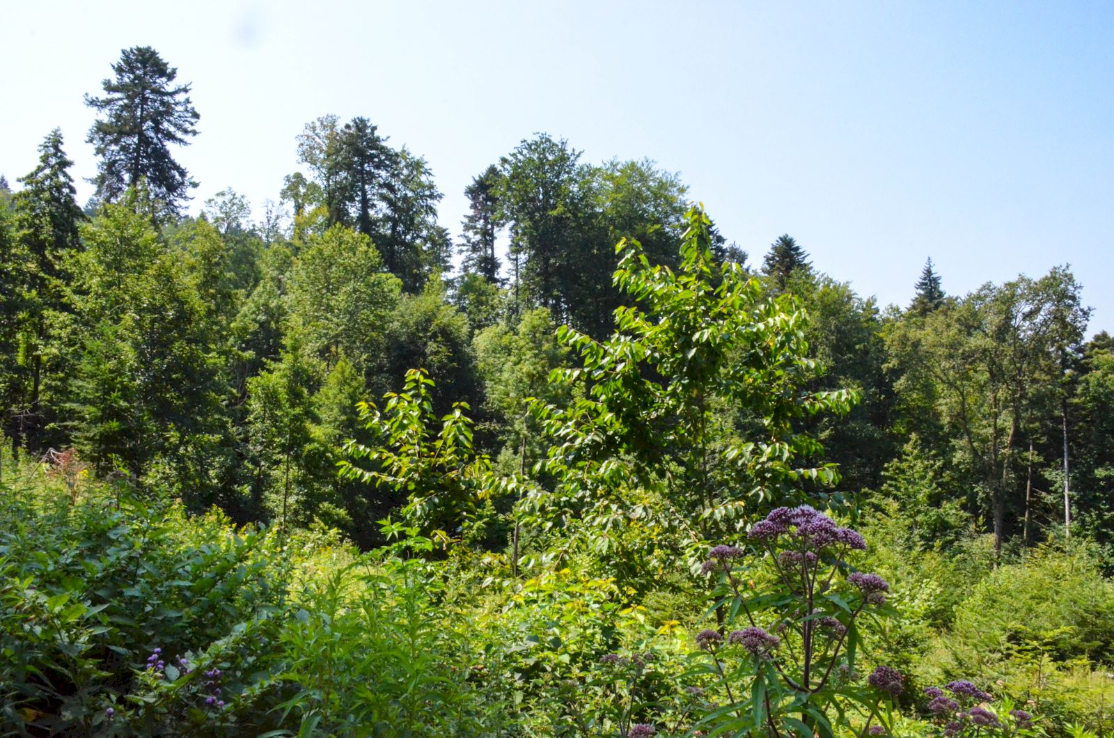 Waldstück mit lockerer Bepflanzung von Nade- und Laubbäumen und Büschen.