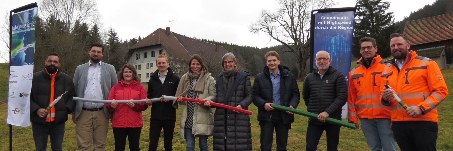 Die genannten Personen stehen auf einer Wiese und halten Breitbandkabeln vor sich, lächeln.