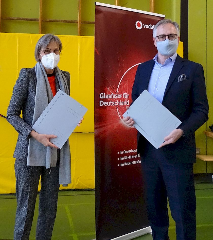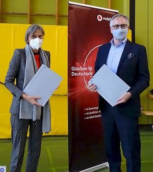Verbandsvorsitzende Landrätin Störr-Ritter und Rolf-Peter Scharfe, Leiter Glasfaser-Kooperationen von Vodafone Deutschland, mit Ausfertigungen des Netzbetriebsvertrages