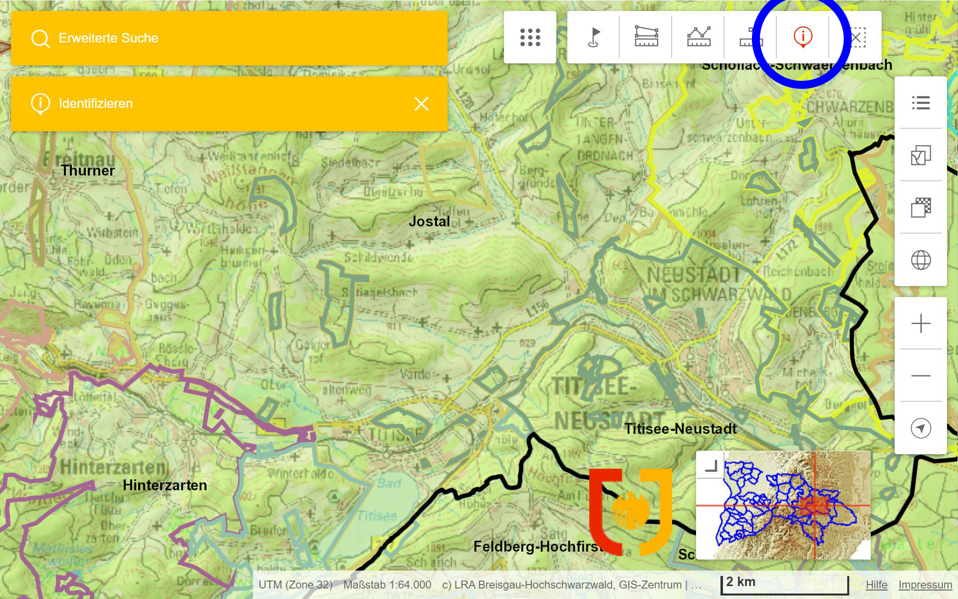 "Identifizieren" aktivieren (blauer Kreis) und in die Karte klicken.