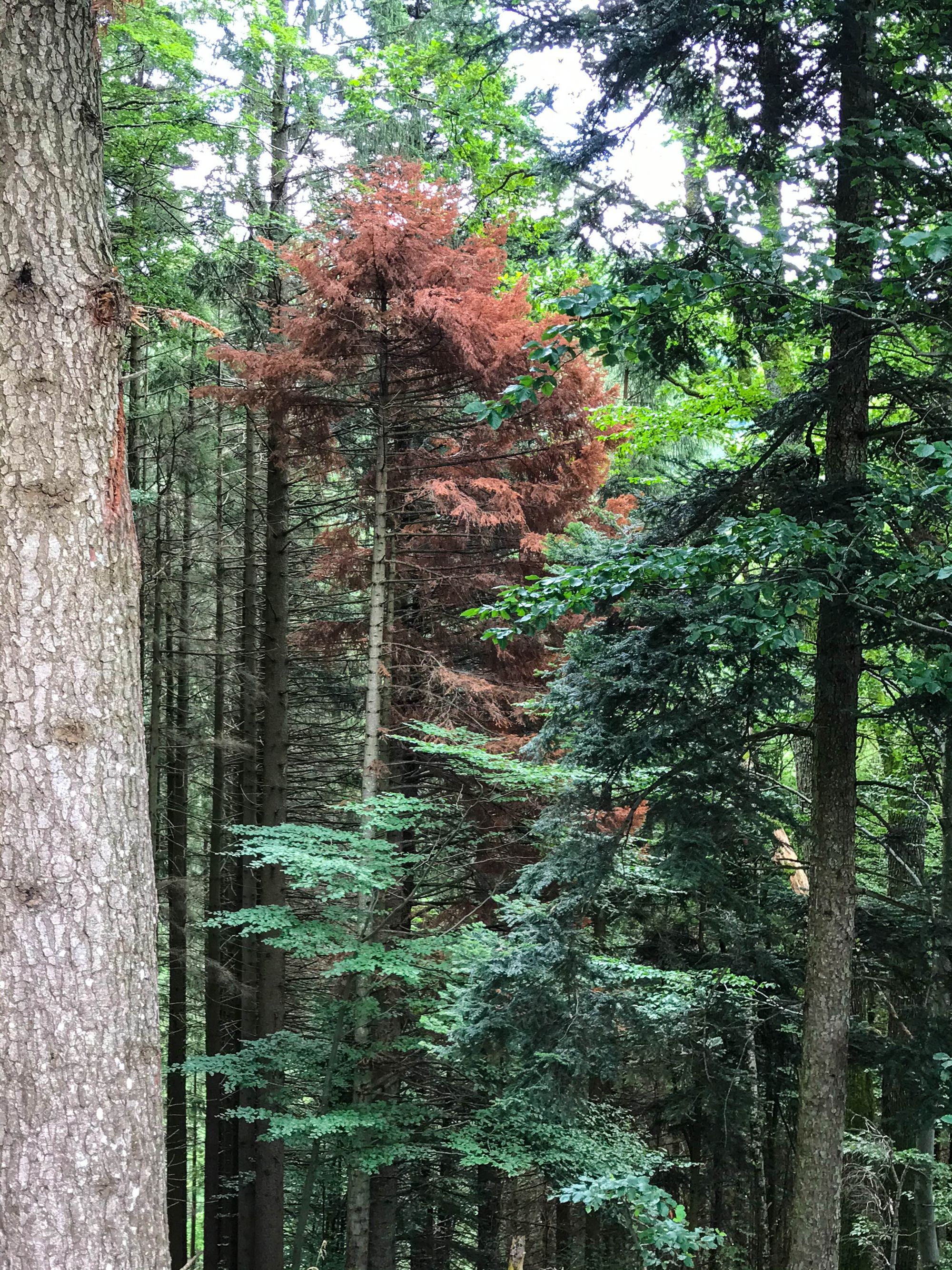 Eine abgestorbene, braun verfärbte Tanne