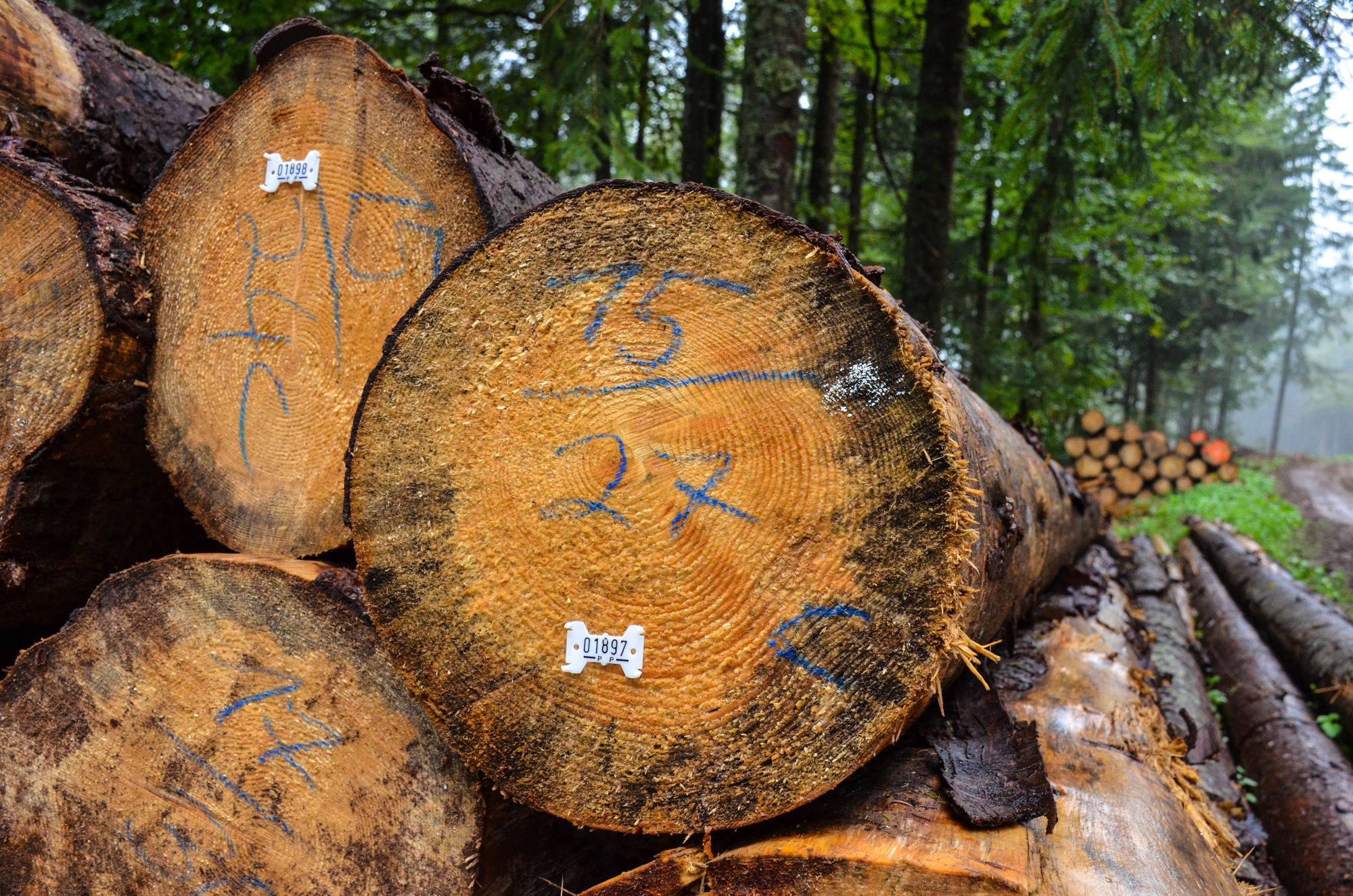 Fichtenstammholz, markiert und bereit zur Abholung