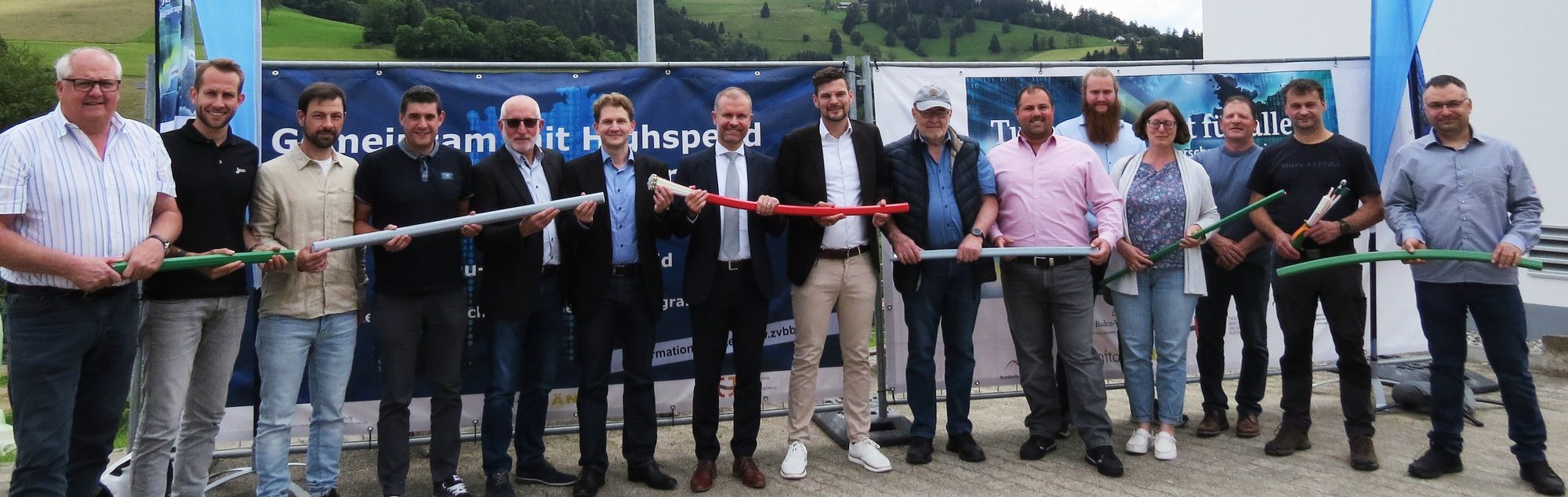 Von links: Johannes Rimmele und Jakob Pauly (Johann Joos GmbH), Steffen Moser und Christoph Bernauer (regioDATA GmbH), Friedrich Arz (Vodafone GmbH), Verbandsgeschäftsführer Alexander Schmid, Verbandsvorsitzender Landrat Christian Ante,  Bürgermeister Benjamin Bröcker, und die (Alt)Gemeinderäte Hans-Peter Buttenmüller, Benjamin Kindle, Johannes Rees, Dr. Sonja Amann, Otmar Wießler, Thomas Wießler sowie Natale Riesterer.