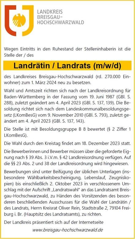 Am Freitag, den 1. September 2023, ist die Stellenausschreibung für eine neue Landrätin oder einen neuen Landrat für den Landkreis Breisgau-Hochschwarzwald veröffentlicht. Demnach können Bewerberinnen und Bewerber ihre Unterlagen vom 2. September bis einschließlich 2. Oktober 2023 beim Landratsamt einreichen.